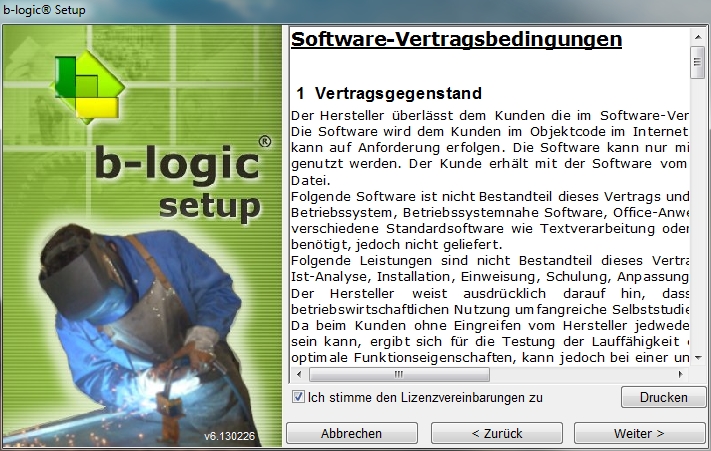 Lesen Sie bitte unsere Lizenzbedingungen. Wenn Sie Ihnen zustimmen, bestätigen Sie dies bitte indem Sie den Haken in das Feld "Ich stimme den Lizenzbedingungen zu" setzen und auf "Weiter" klicken.