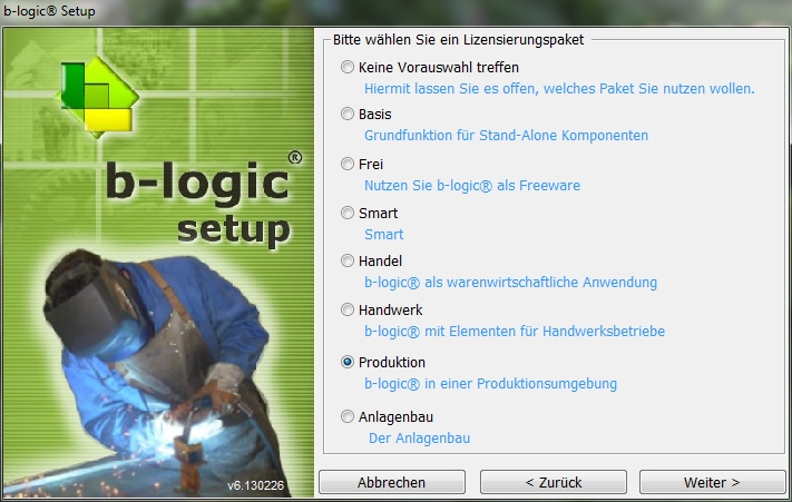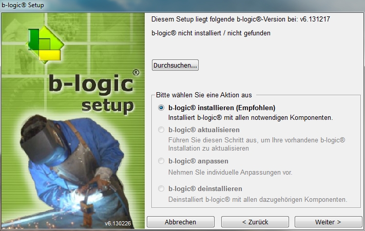Im folgenden Fenster wählen Sie Ihre Installationsart aus. Sofern noch keine b-logic Installation an diesen PC vorgenommen wurde, steht die Vorauswahl richtig auf "b-logic installieren". Installationsarten: