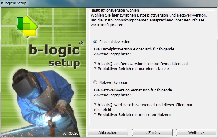 Sie können nun entscheiden wie b-logic bei Ihnen zum Einsatz kommt. Entscheidend ist die Wahl nur für den weiteren Installationsverlauf. Wenn Sie "Einzelplatz" wählen, wird Ihnen das Setup anbieten die Datenbank lokal auf Ihrem Rechner abzulegen und somit das Arbeiten mit b-logic nur auf diesen Rechner auszuführen. Diese Variante eignet sich hervorragend, um b-logic erst einmal zu testen. Wenn Sie Netzwerkversion wählen geht das Setup davon aus, es exisitiert eine Datenbank auf einem Server innerhalb Ihres Netzwerkes. Fahren Sie mit "Weiter" fort. |
