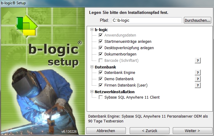 Dieser Setup-Schritt gibt Ihnen die Möglichkeit die Komponenten, die installiert werden sollen, an- und abzuwählen. - Startmenüeinträge und Desktopverknüpfung setzt entsprechende Einträge auf Ihrer Windows-Oberfläche. - Dokumentenvorlagen sind Microsoft-Word Vorlagen die Sie aus b-logic heraus bedienen können. Dabei handelt es sich zum Beispiel um eine Brief- und Fax-Vorlage. - Sybase SQL Anywhere 11 Client ist der Treiber, den b-logic benötigt um mit ihrer Datenbank zu kommunizieren. Ist dieser Haken nicht automatisch gesetzt, so haben Sie diesen Treiber schon auf Ihren System installiert. Wählen Sie diesen Punkt ab, wenn Sie mit einer älteren oder neueren Version dieses Treibers arbeiten möchten. Beachten Sie dabei aber die Vorraussetzungen von b-logic und die Beschaffenheit der Datenbank. Wenn Sie bei diesen Schritt auf "Weiter" klicken, werden anschließend alle erforderlichen Dateien an ihren Zielort kopiert. Fahren Sie mit "Weiter" fort. |