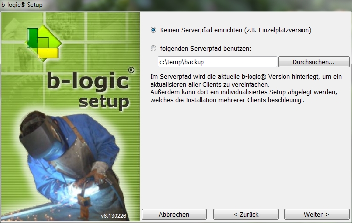 Ist die Verbindung zur Datenbank eingerichtet, werden Sie in diesem Schritt gefragt, ob Sie einen Serverpfad ("Abgleichpfad" für spätere Updates) definieren möchten. Dieser Pfad spielt zum einen nur eine Rolle, wenn Sie mit der Netzwerkversion arbeiten und zum anderen, wenn Sie auf Ihren Server diesen Pfad bereits definiert haben. Der Pfad dient im Späteren zum Abgleichen von b-logic Versionen. Wenn Sie eine neue b-logic Version haben, legen Sie diese auf dem Server ab und die einzelnen Clients "bedienen" sich der Dateien die in diesem Serverpfad("Abgleichpfad") befinden. Fahren Sie mit "Weiter" fort. |