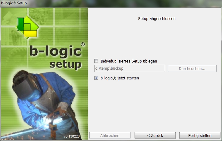 Die Installation ist jetzt erfolgreich abgeschlossen. Sie haben die Möglichkeit das Setup individuell mit den soeben gewählten Optionen abzulegen und auf einen anderen PC genauso ausführen zu lassen. Um dies anzuwenden setzen Sie den Haken bei "Individualisiertes Setup anlegen" und geben Sie einen Speicherort an. Lassen Sie den Haken bei "b-logic jetzt starten" gesetzt und fahren Sie mit "Fertig stellen" fort. |